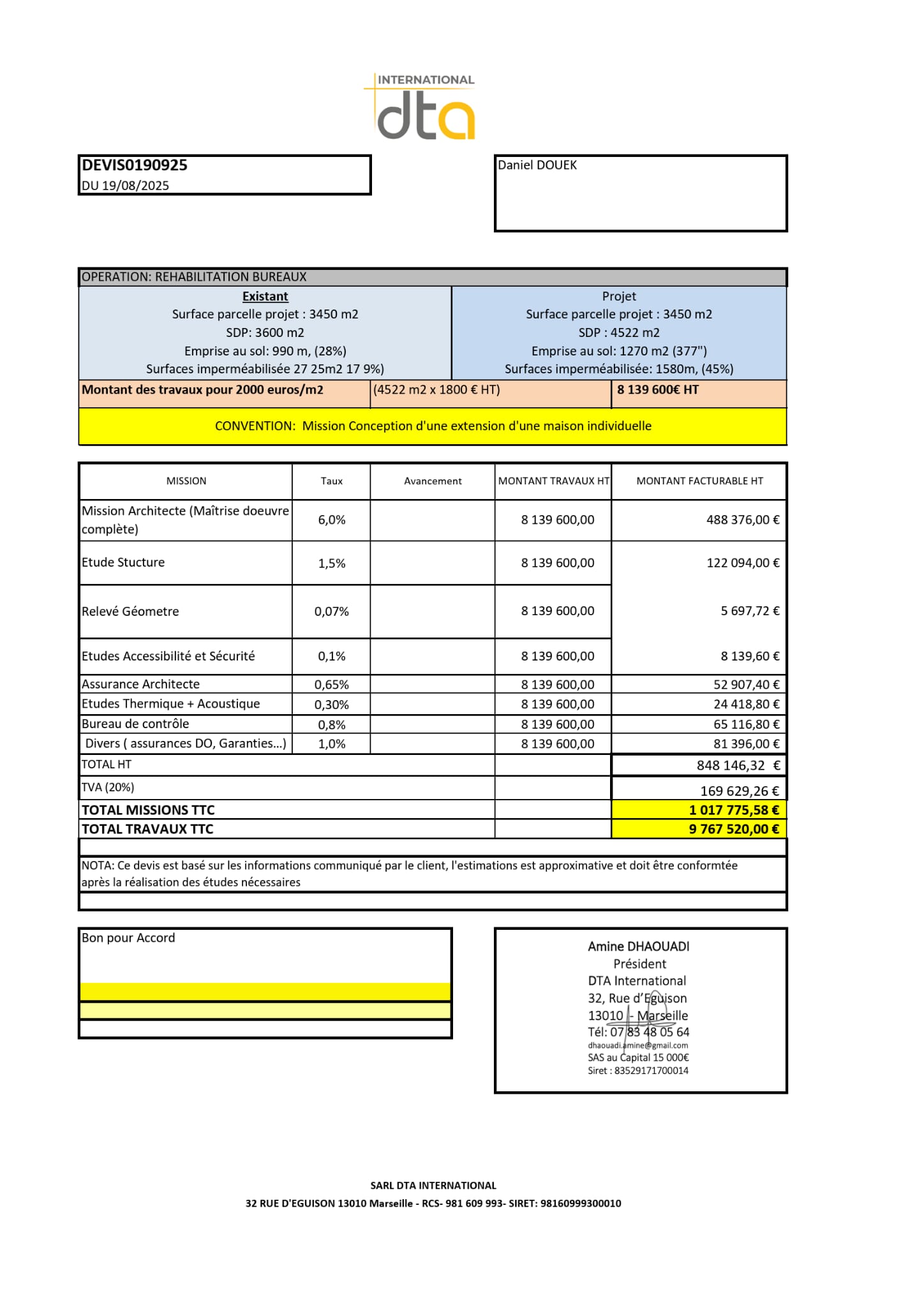 Devis détaillé du cabinet DTA International pour la réhabilitation du bâtiment.
